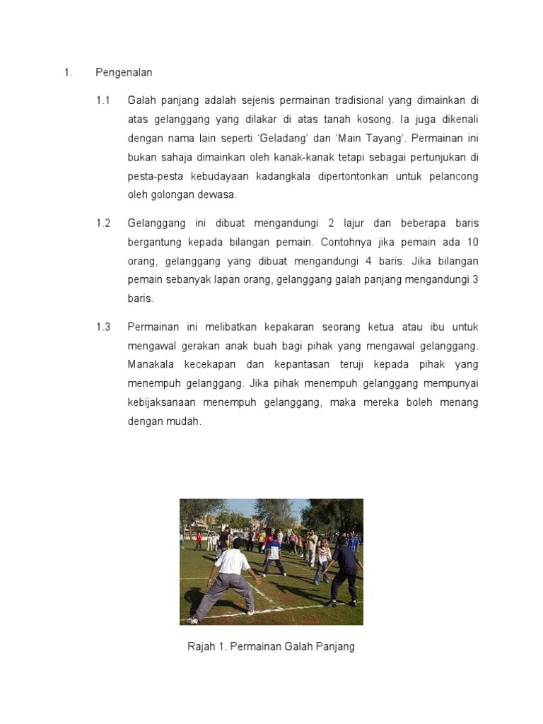 Dua orang bertugas memegang tali, sementara pemain lainnya bermain sesuai urutan yang telah disepakati. Galah panjang adalah sejenis permainan tradisional yang dimainkan di atas gelanggang yang dilakar di atas tanah kosong. Tali yang digunakan untuk bermain biasanya menggunakan karet yang disambung satu persatu sehingga menjadi panjang. Galah panjang permainan tradisional yang dimainkan di luar rumah. 1)nor shahidah bt ahamad 2) sahila bt pengertian galah panjang adalah sejenis permainan tradisional yang dimainkan di atas gelanggang yang dilakar di atas tanah kosong. Permainan tradisional ini dimainkan secara grup atau tim dan melibatkan dua. Gelanggang galah panjang dibuat mengikut bilangan pemain yang bermain. Kumpulan terbahagi kepada penyerang dan pertahanan. Galah panjang merupakan permainan yang sangat menyeronokkan. Tradisional yang dimainkan di atas gelanggang yang dilakar di atas tanah kosong. Permainan tradisional kesembilan yaitu, ular naga panjang. This is permainan galah panjang by hanif razak on vimeo, the home for high quality videos and the people who love them. Namun permainan tradisional mula ditinggalkan oleh masyarakat.